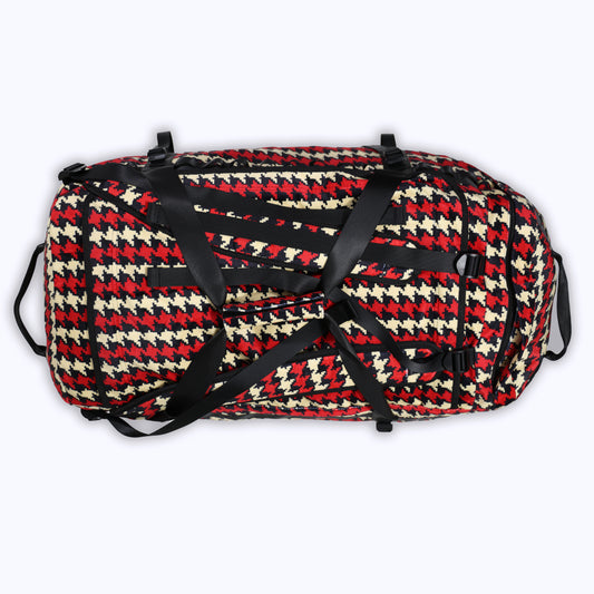 houndstooth velour duffel bag backpack in cream/crimson (black)